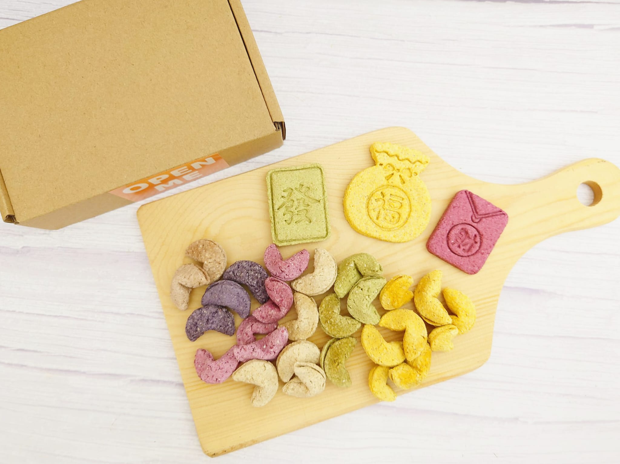 Money Come Money Come! This exclusive package not only includes our signature rainbow fortune cookies but also comes with Money Bag and Facai Cookies, symbolizing good fortune and prosperity throughout the year!