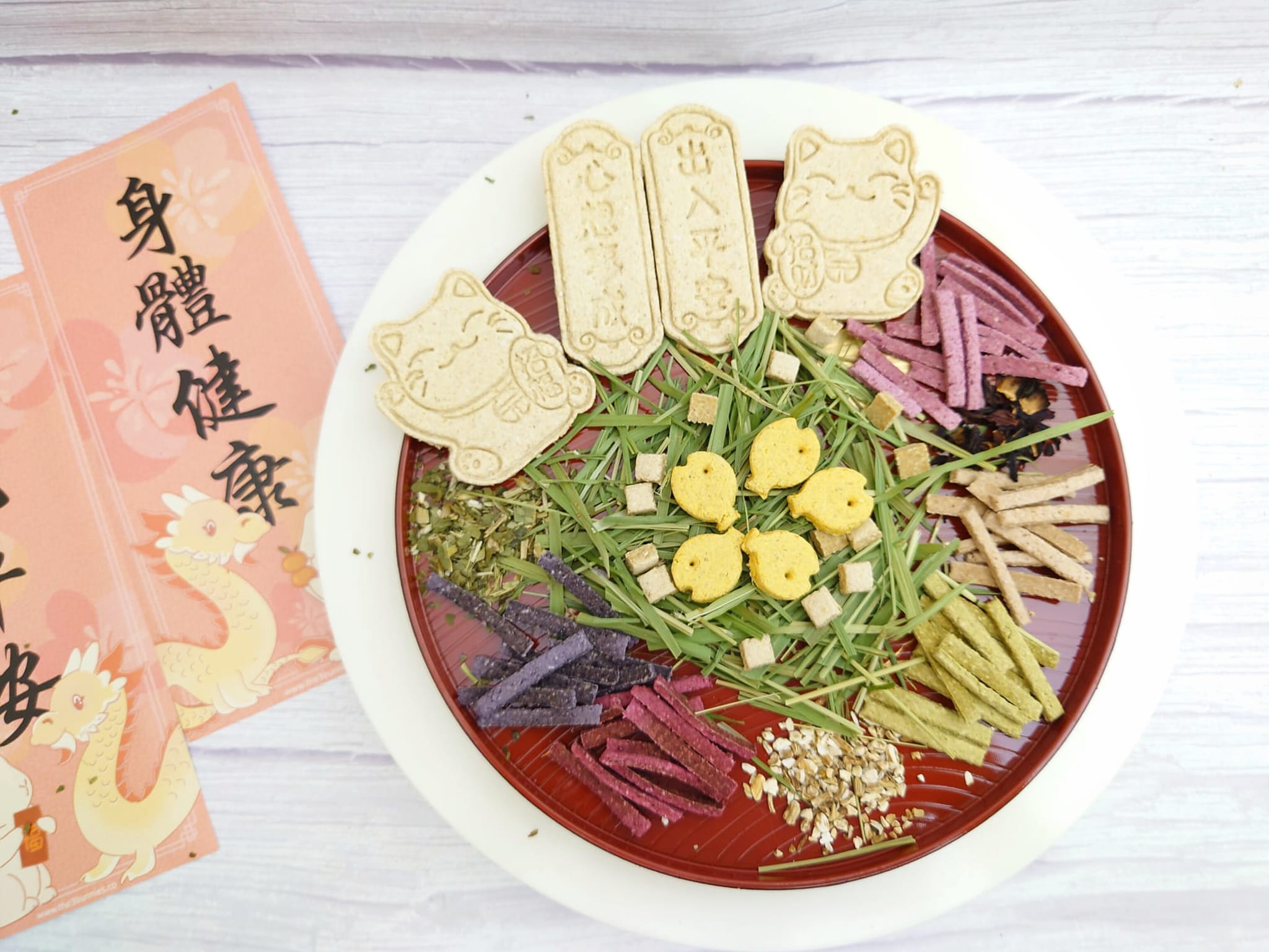 Our Signature Prosperity Lohay Set integrates the goodness of organic herbs to promote overall well-being for your beloved bunnies. Let your bunnies indulge in the wholesome joy of our carefully selected organic herbs, paired with delectable cookies, to bring prosperity and vitality to their lives.